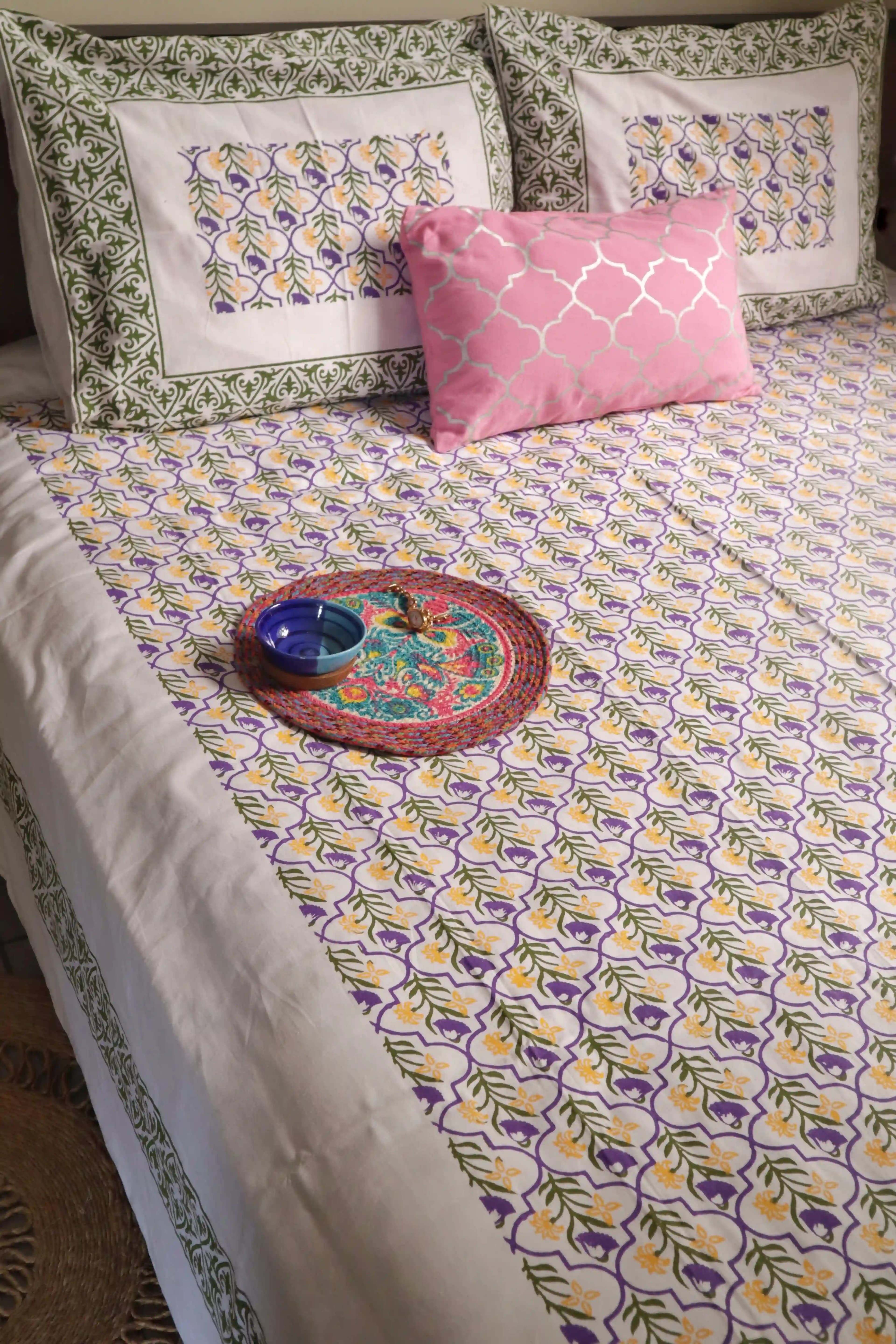 This bedsheet is made of premium cotton and features a beautiful block print design. It comes with two pillow covers, which are also made of premium cotton. The bedsheet is available in a variety of sizes to fit any bed.