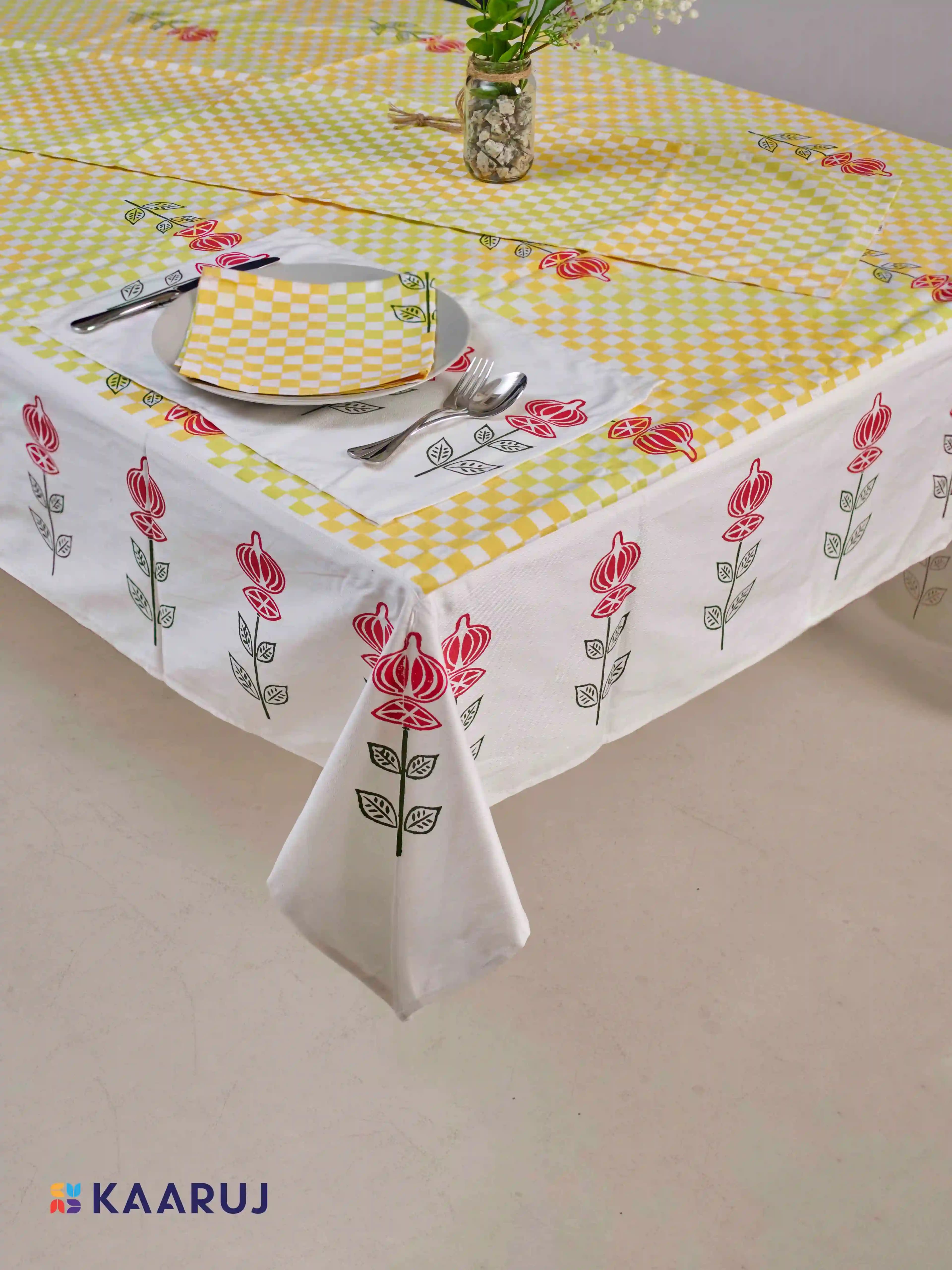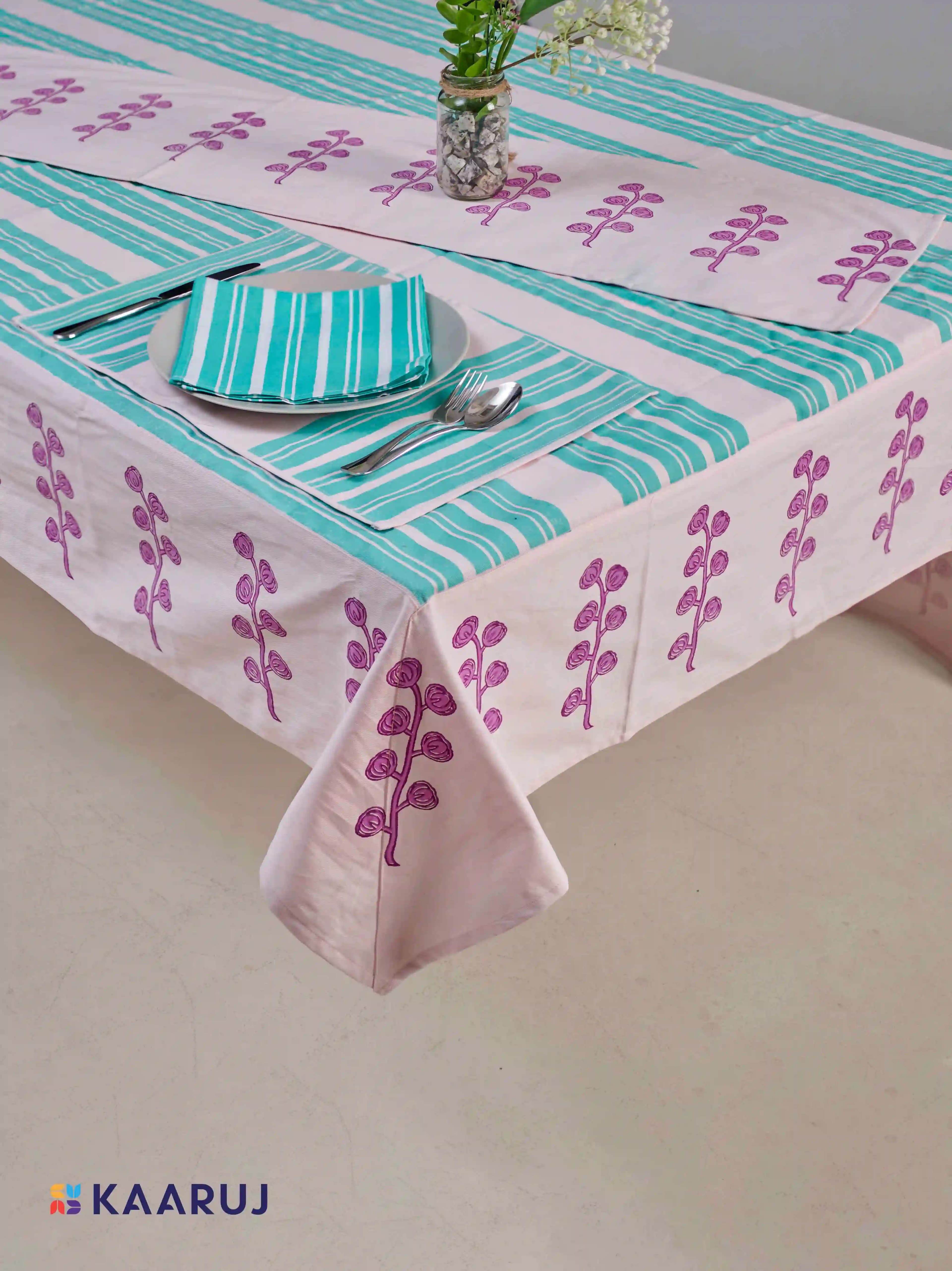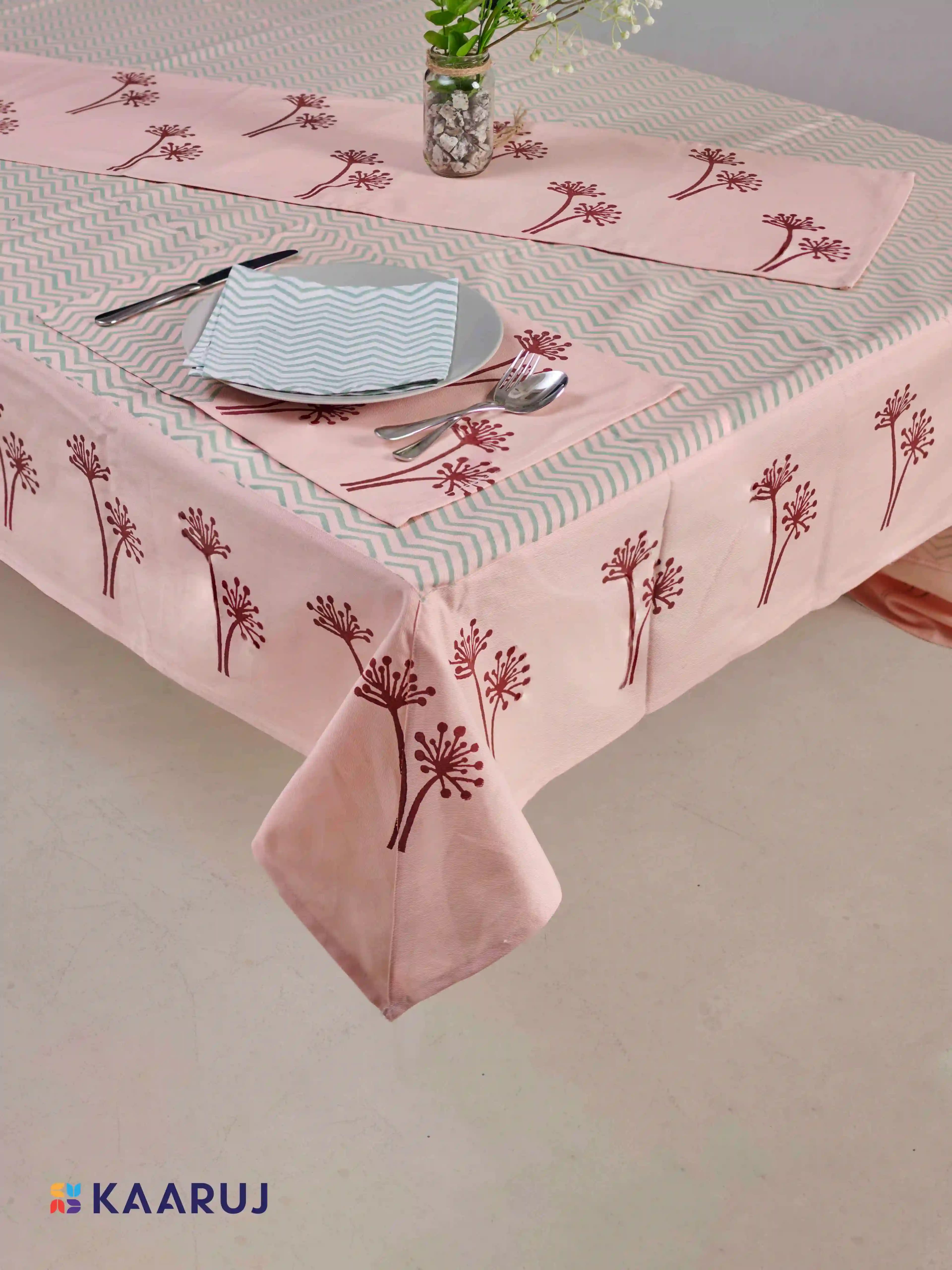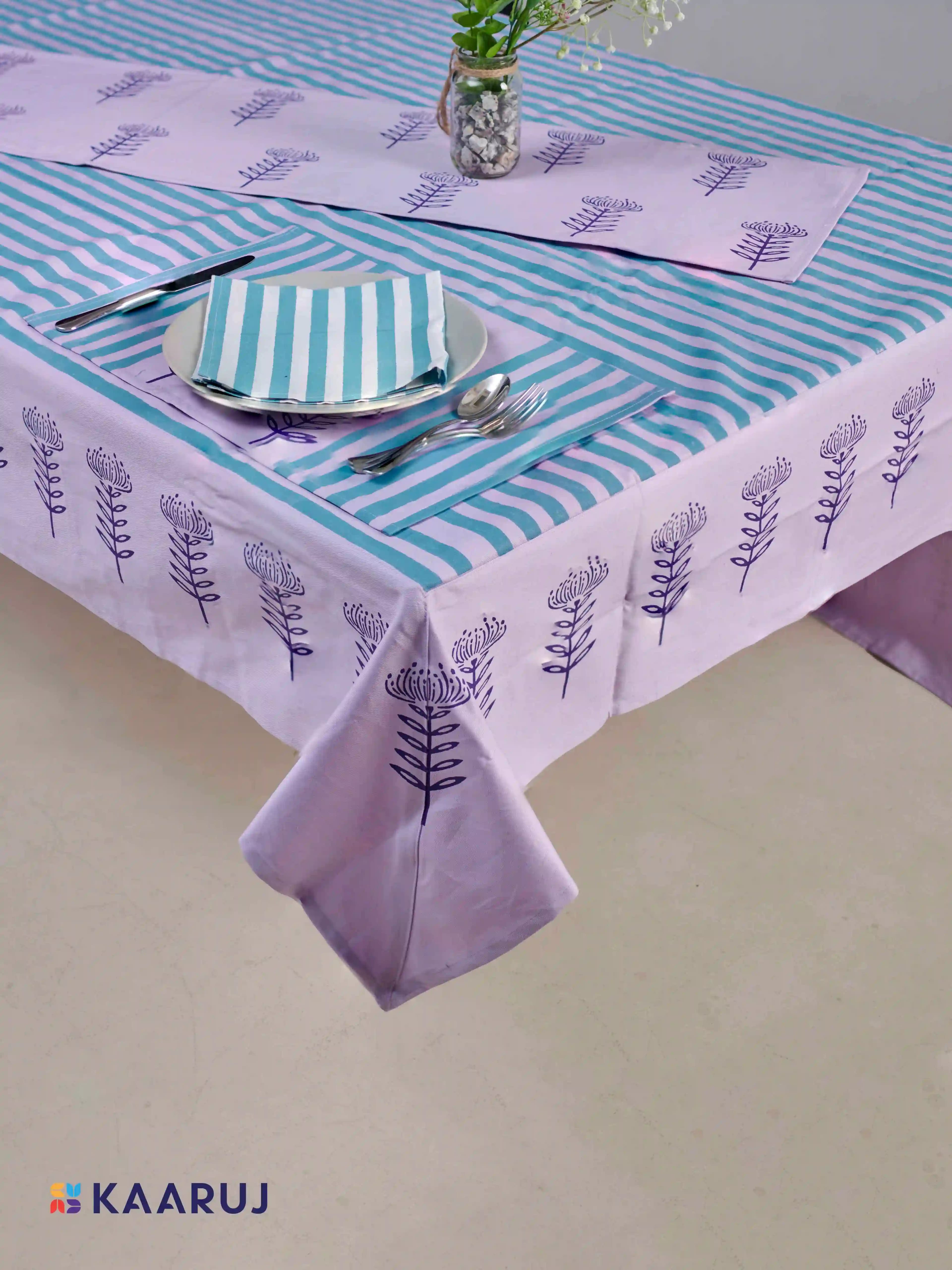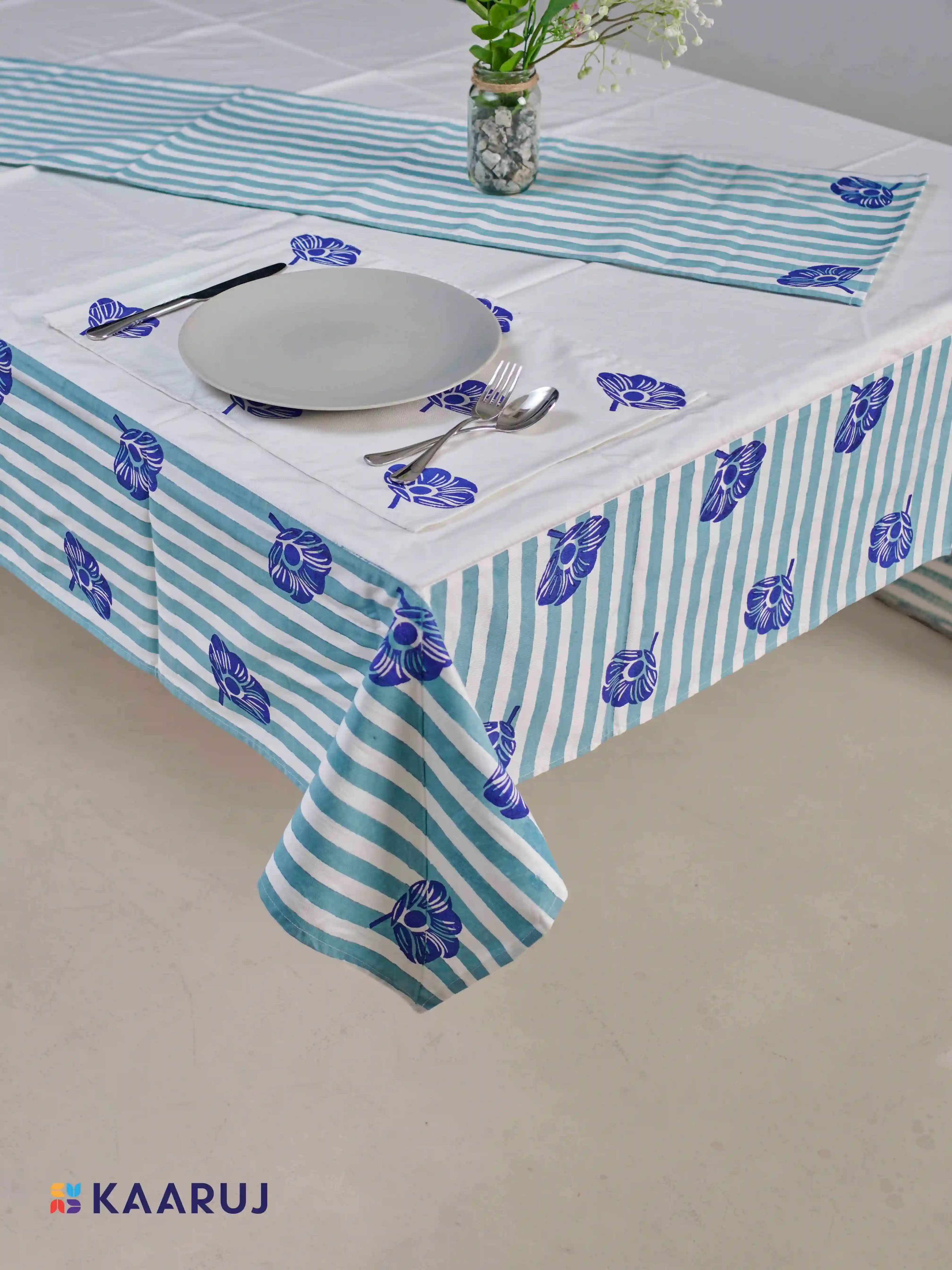 Description: Elevate your dining table with this beautiful tablecloth set featuring a charming geometric floral design in white on a crisp blue background. This set is made from 100% cotton twill fabric for a touch of elegance and includes a tablecloth, runner, and napkins.